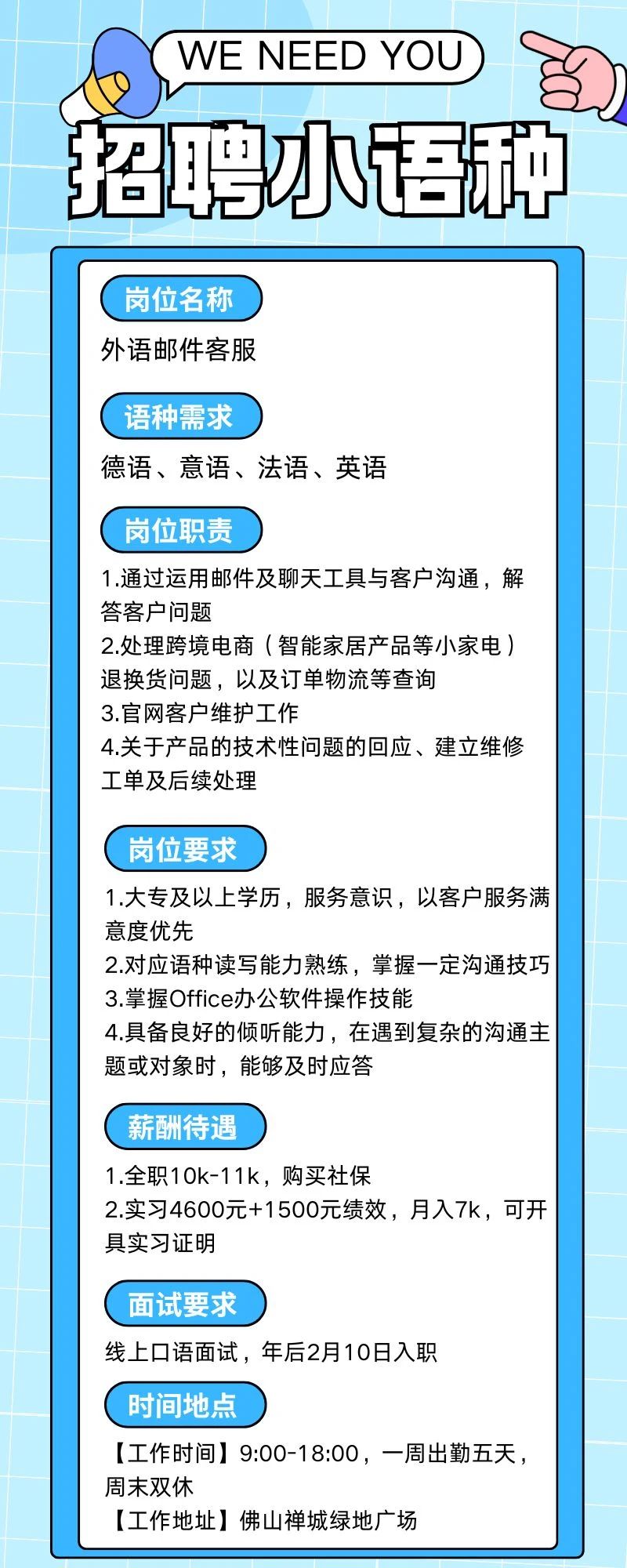 | 【年前线上面试】佛山维音招募德意法英小语种人才,免费提供公寓式住宿条件 | |