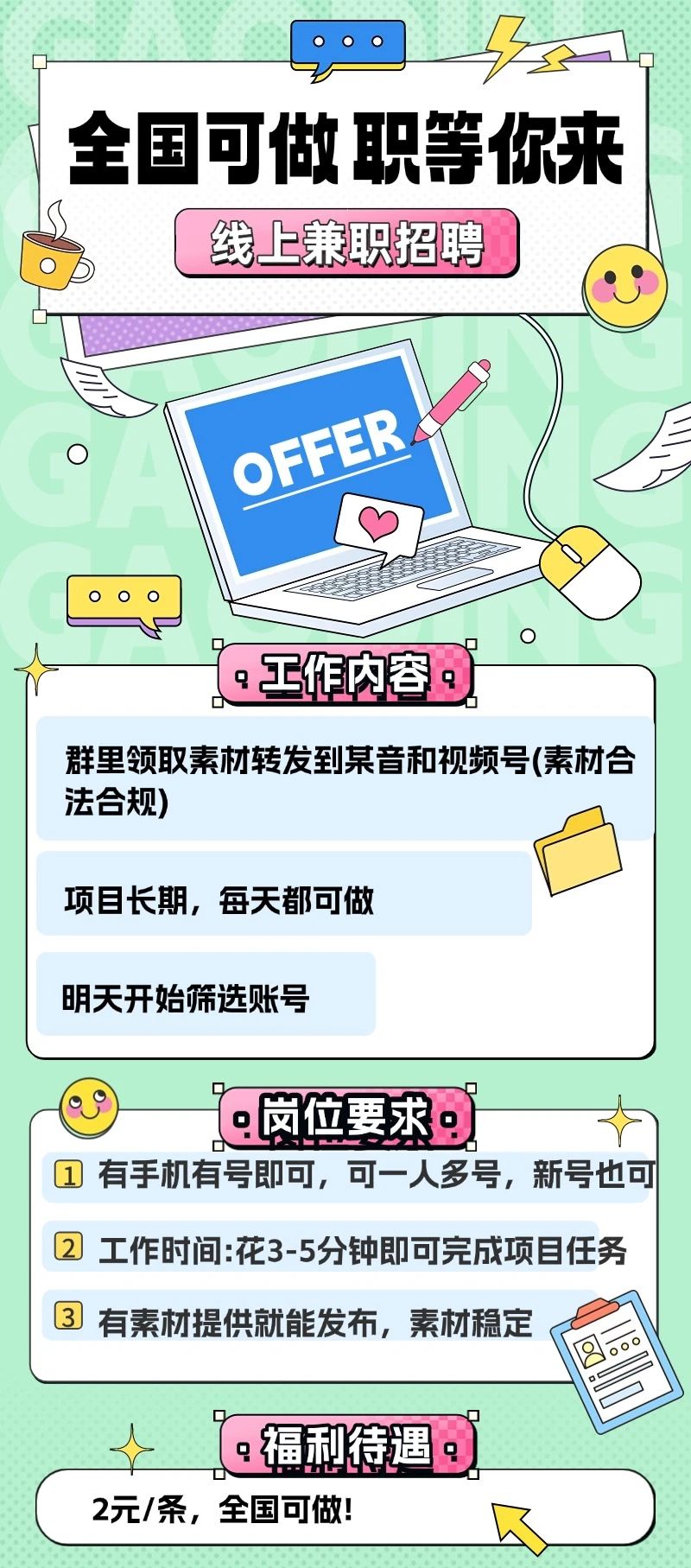 | 全国可做线上兼职:可月入200-400元!线上兼职种草员,项目稳定,可长期! |