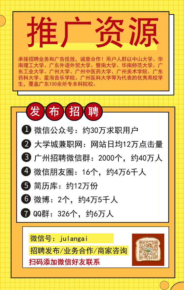 | 大学城兼职网微信公众号:dxcjob 大学城兼职网招聘项目合伙人 找兼职防骗提示 发表时间:2025/12/10 22:46:00 注册求职简历 浏览量:26747 | |